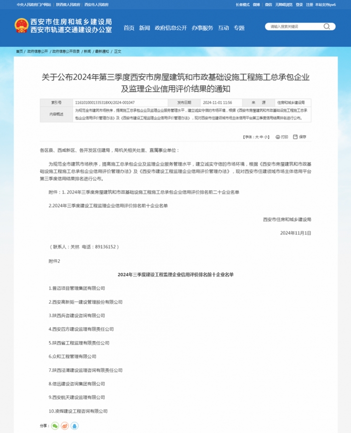 2024年11月1日,西安市住房和城乡建设局公布了《2024年第三季度西安市房屋建筑和市政基础设施工程施工总承包企业及监理企业信用评价结果的通知》。平博手机官方网站在西安市建设工程监理企业信用评价中位列榜首!自西安市住建局开展2023年度监理企业信用评价工作以来,从2023年度截止2024年前三个季度,公司持续保持第一名,彰显了公司管理服务整体高质量、高水平!