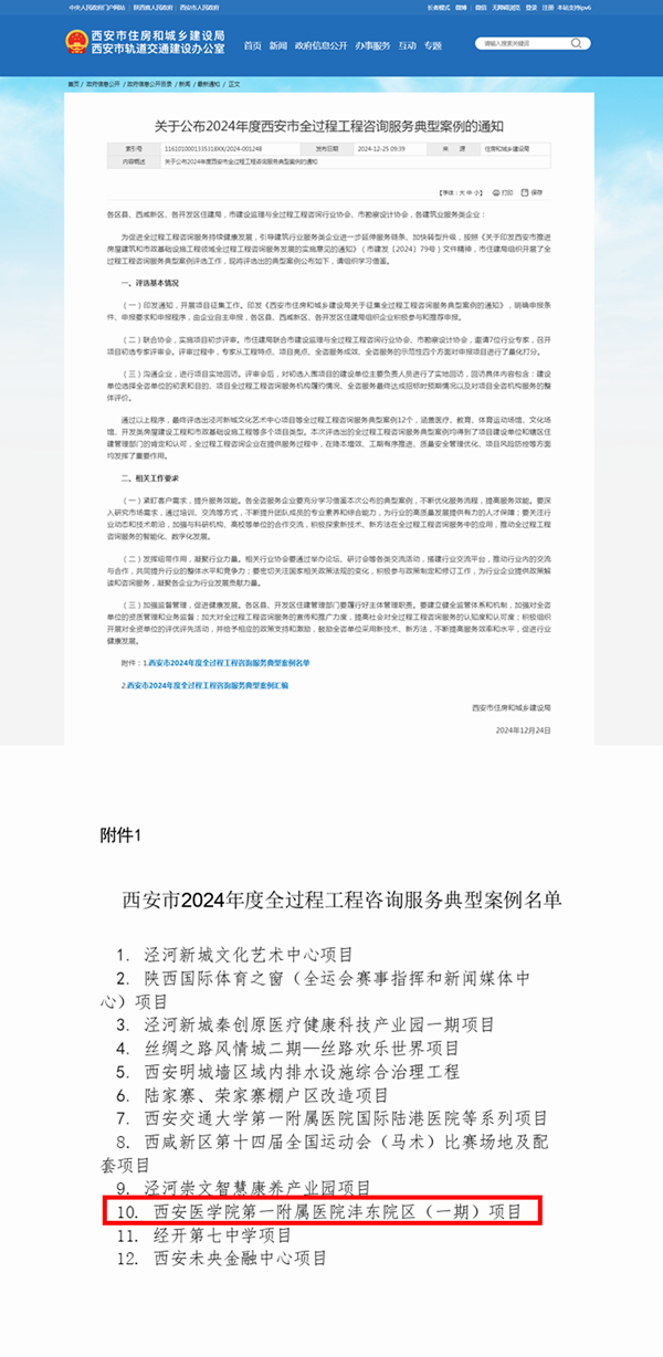 2024年12月24日,西安市住房和城乡建设局下发《关于公布2024年度西安市全过程工程咨询服务典型案例的通知》,公布了“西安市2024年度全过程工程咨询服务典型案例名单”,共12个典型案例入选,我公司提供全过程工程咨询服务的西安医学院第一附属医院沣东院区(一期)项目位列其中,凭借卓越的服务效能得到了项目建设单位和辖区住建管理部门的肯定和认可,最终成功入选。