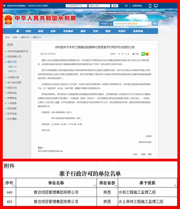 2025年1月8日,公司资质申报工作传来喜讯,经中华人民共和国水利部核准,公司喜获水利工程施工监理乙级、水土保持工程施工监理乙级两项资质!
