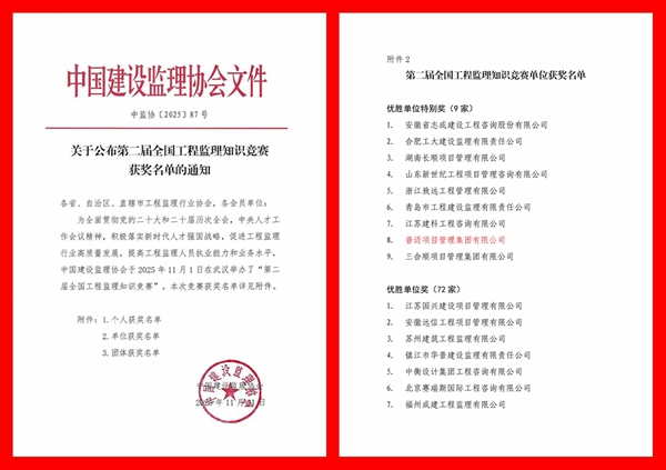 2025年11月21日,中国建设监理协会公布了第二届全国工程监理知识竞赛获奖名单,公司从全国诸多参赛单位中脱颖而出,荣获优胜单位特别奖!