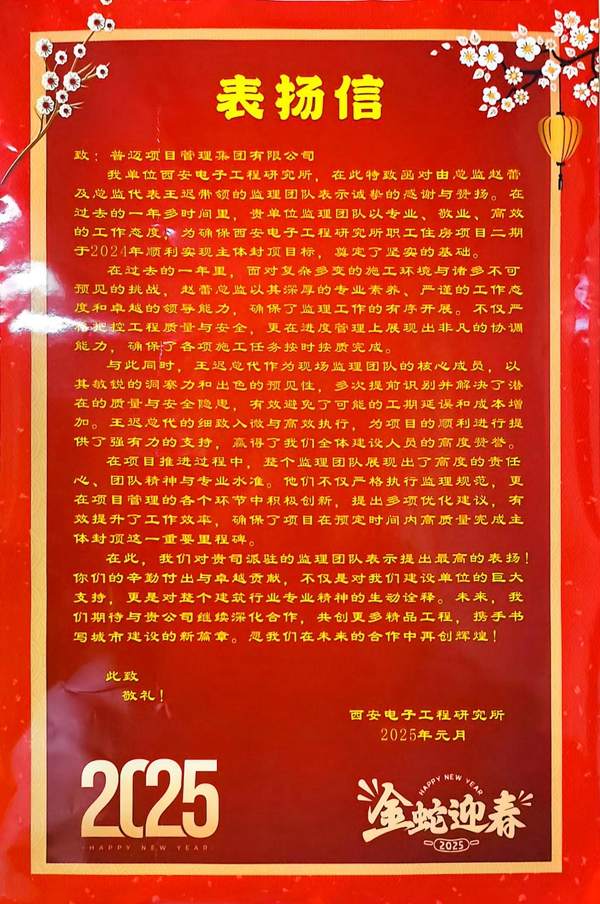 信中写到,在过去的一年里,面对复杂多变的施工环境与诸多不可预见的挑战,赵蕾总监以其深厚的专业素养、严谨的工作态度和卓越的领导能力,确保了监理工作的有序开展。不仅严格把控工程质量与安全,更在进度管理上展现出非凡的协调能力,确保了各项施工任务按时按质完成。