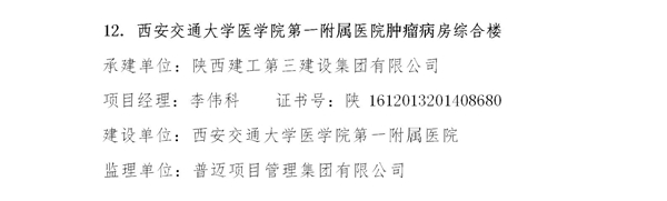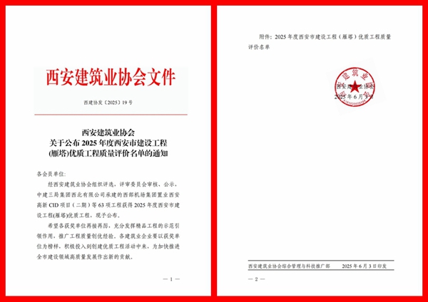 2025年6月3日,西安建筑业协会发布了《关于公布2025年度西安市建设工程(雁塔)优质工程质量评价名单的通知》,由我公司监理的西安交通大学医学院第一附属医院肿瘤病房综合楼、礼泉县污水处理厂提标扩建工程、西安航天基地祥居雅苑(韩家湾村及二府井村安置小区)一期工程等3项工程荣膺此项殊荣!