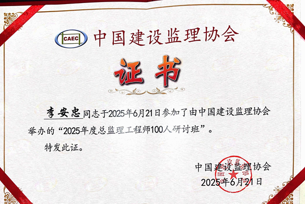 为全面贯彻落实党的二十届三中全会精神,助力实施人才强国战略,加强总监理工程师队伍建设,2025年6月21日,由中国建设监理协会主办,湖南省建设监理协会协办的“2025年度总监理工程师100人研讨班(1期)”在湖南长沙成功举办。我公司副总工程师李安忠参加本次研讨班,聆听了中国工程监理大师、高校教授、行业专家围绕工程监理行业发展,工程质量控制与安全生产管理,经典案例分享以及总监理工程师履职要点等内容进行的精彩授课。