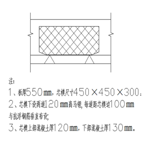 (5)在施工过程中采取措施防止损坏芯模,板面钢筋安装之前对已损坏的芯模进行更换,板面钢筋安装之后对损坏的芯模应采取有效的措施进行修补和封堵,防止混凝土漏入。