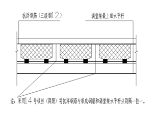 根据弹好的芯模控制线及芯模设计间距安放芯模,芯模安装完成后安装抗浮钢筋同时采用铁丝进行固定。采用双股14#铁丝穿过底模上的定位孔将抗浮钢筋拉结固定在满堂架水平杆上(铁丝严禁拉结在胶合板下的木龙骨上,否则会将整个楼板底模拉起,起不到固定芯模的作用),然后再采用双股14#铁丝隔一将抗浮钢筋与板底筋拉结固定(如图示5、图示6、图示7),防止芯模上浮而增加楼板厚度。